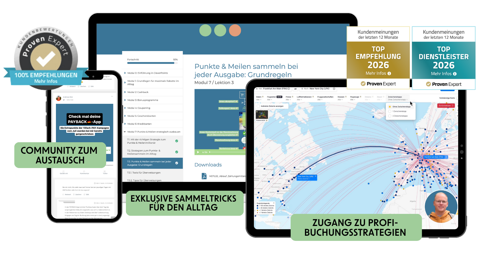 Nutze unsere geschlossene CleverPoints-Community zum Austausch mit anderen Kursteilnehmern. Erfahre von aktuellen Aktionen zum Punkte- oder Meilensammeln sowie Tipps & Tricks aus erster Hand. Du hast Fragen zu einzelnen Lektionen im Kurs? Hier wird dir geholfen.
