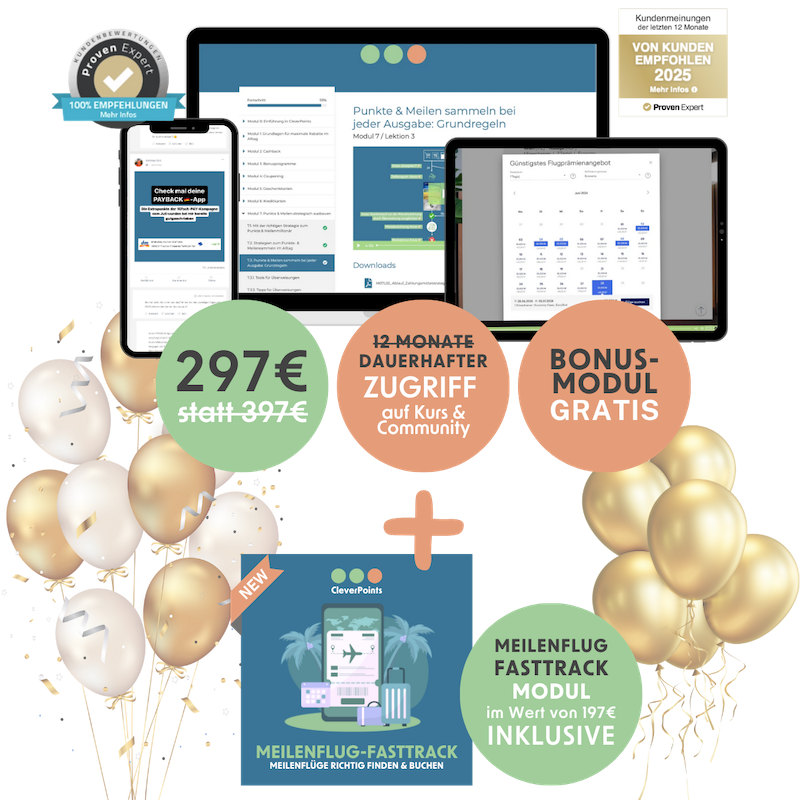 (statt 12 Monate)auf alle Kursinhalte - Bonus 1: Modul mit zusätzlichen Punkte- & Meilenhacks aus der Praxis